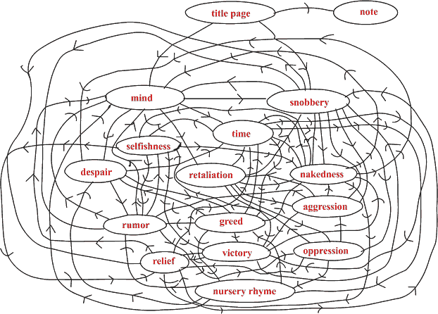 The poem follows the very basic structure of having many pages with a tiny "poemlet" on each one. The pages are called "nodes" in the hypertext and the links are the arrows connecting the nodes. If you have ever taken a math class which touches on graph theory, you will recognize this structure as a directed graph. Put simply, a graph is a diagram of dots with the dots linked by arrows, which mean "you can go from this dot to that dot." The dots in a graph are called nodes and the arrows are sometimes called (directed) edges. A graph is connected if all the dots can be reached from every dot; in other words a connected graph is in a single piece. A graph has a Hamiltonian path if there is a way to travel through each node without coming back to a node you have already visited. Some people think a hypertext should have Hamiltonian paths, or at least ways of reading that don't involve having to go back very often to pages you have already seen. A tree is a graph with no loops, and it can be seen as a starting point (the root of the tree) with a bunch of choices, and then the choices have choices, and so on until you reach the leaves, which are the endpoints and have no more choices to take. Hypertexts in which there is a story and you choose options for what happens and what happens next is based on your choice, which is foillowed by another choice etc. are often trees. An example of a hypertext based on a tree is "The Bar Game" in "The Usability Chronicles," by Martha Deed and Millie Niss. Poetry, on the other hand, often contains loops and has a more complicated structure.